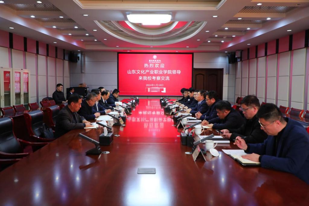 1月10日下午,山东文化产业职业学院董事长李京平,校长曹胜强,党委副书记、副校长姜雪松等一行6人来校考察交流。党委书记林松柏,党委副书记、校长郑秀文,党委委员、副校长孙正热情接待来访。双方就人才培养、...查看更多 -