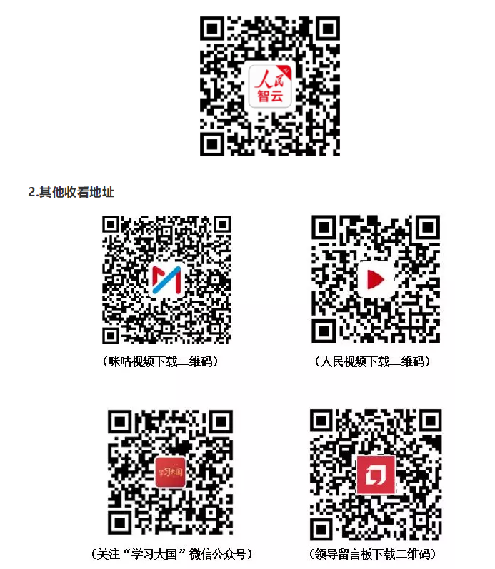 手机、平板收看:应用商店搜索“人民智云”或扫描下方二维码进行下载。点击开屏进入直播页面,观看直播。也可在App首页直播入口,点击进入直播页面进行观看。