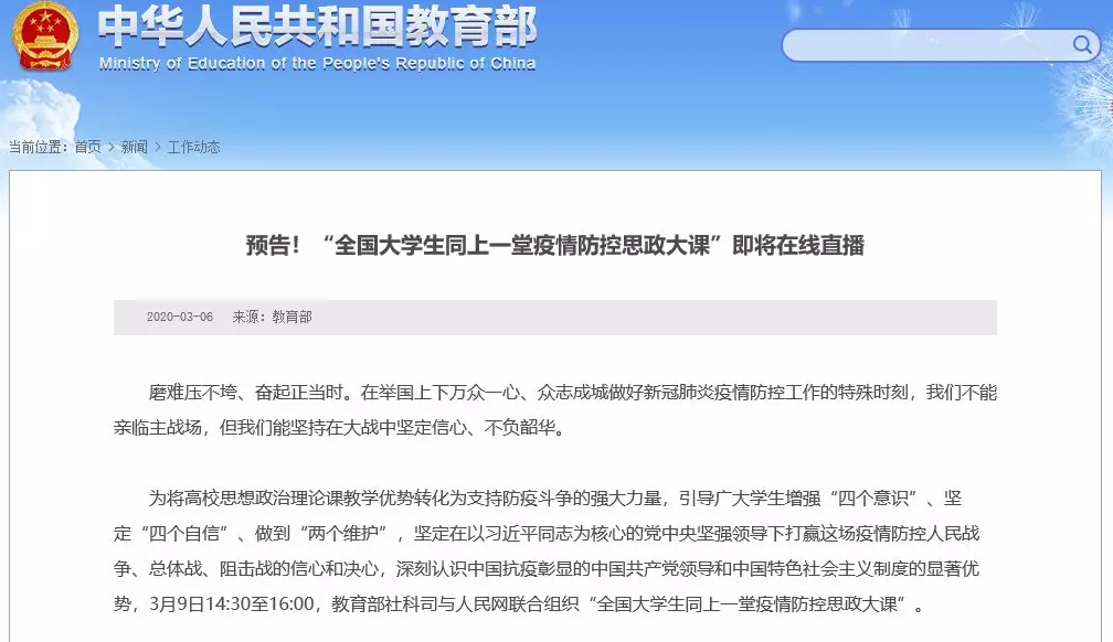 教育部官方网站今天发布“全国大学生同上一堂疫情防控思政大课”即将在线直播预告:3月9日14:30至16:00,教育部社会科学司与人民网联合组织“全国大学生同上一堂疫情防控思政大课”,欢迎关注。