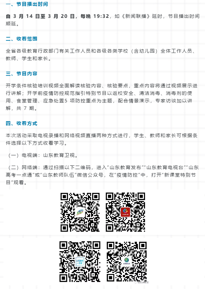 山东省教育厅新型冠状病毒感染的肺炎疫情防控工作领导小组发布《关于组织收看学校开学前疫情防控规范培训特别节目的通知》,要求各高校组织工作人员、教师、学生和家长认真收看,请大家按时收看。