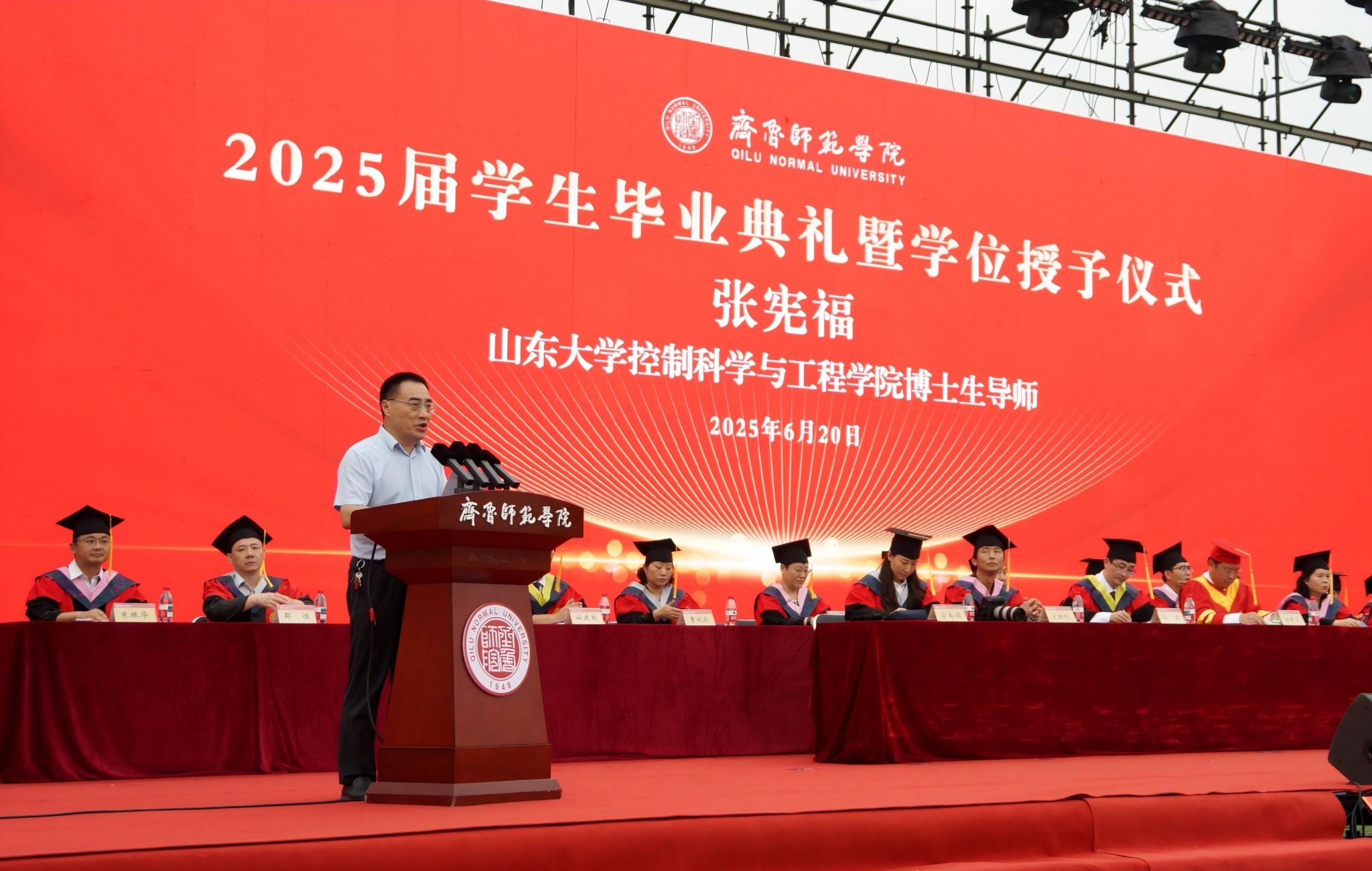 学校党委副书记赵敏,党委委员、副校长孙正,党委委员、副校长孙洪兆,党委委员、统战部部长宋新刚,党委委员、宣传部部长孙磊,党委委员、组织部部长宗美娟,杰出校友代表、山东大学控制科学与工程学院博士生导师张宪福教授出席典礼。学校各二级学院党政负责人、教学管理和学生管理人员、师生代表以及2025届全体毕业生参加典礼。典礼由孙正主持。毕业典礼在雄壮的国歌声中拉开帷幕。