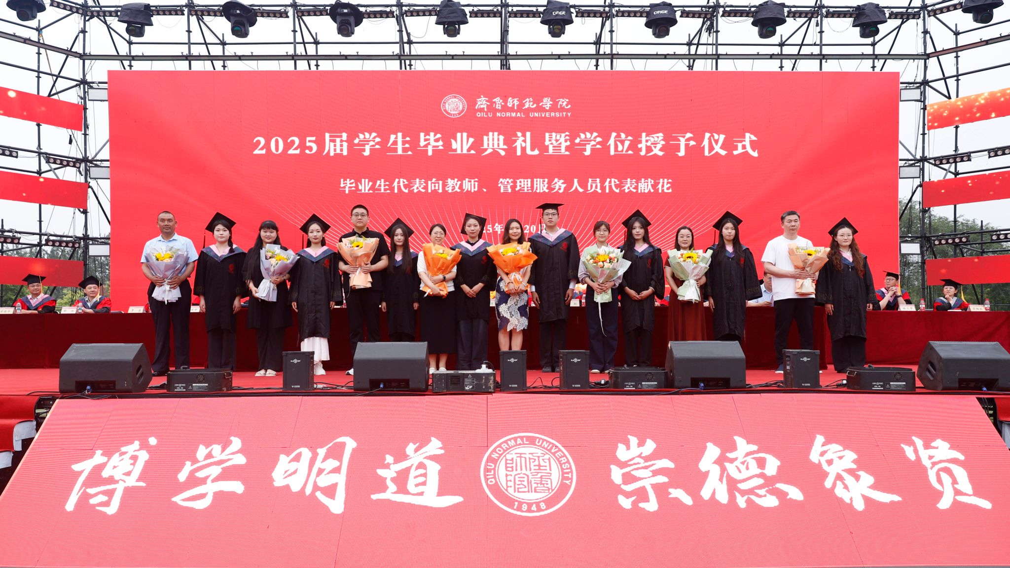 临别之际,毕业生代表向教师代表、管理服务人员代表献上鲜花,感恩他们的温情守护和坚守奉献。