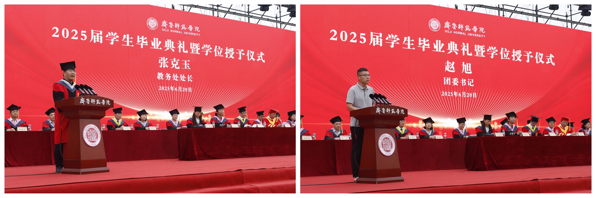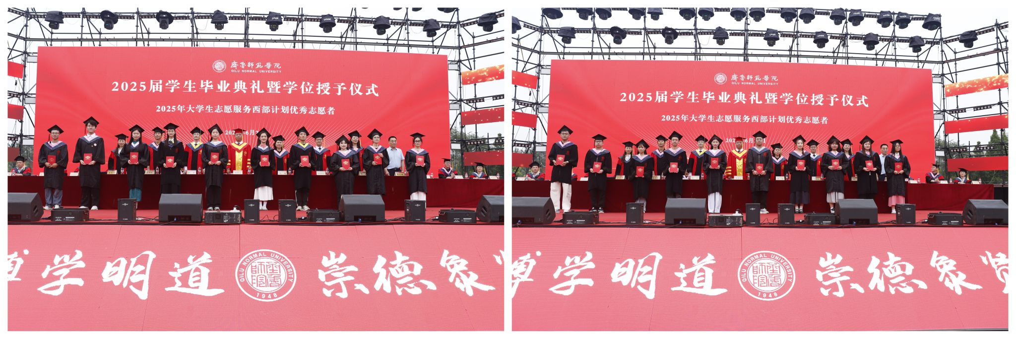教务处处长张克玉宣读2025届普通本科毕业生学士学位和2025届成人高等教育、自学考试本科毕业生学士学位授予决定;团委书记赵旭宣读2025年大学生志愿服务西部计划优秀志愿者名单。郑秀文、赵敏、孙正、孙洪兆、宋新刚、孙磊、宗美娟、张宪福共同为2025年大学生志愿服务西部计划优秀志愿者颁发荣誉证书。