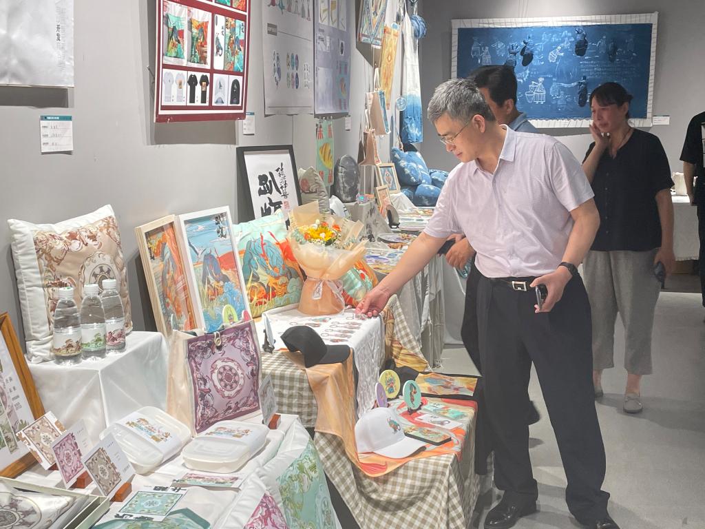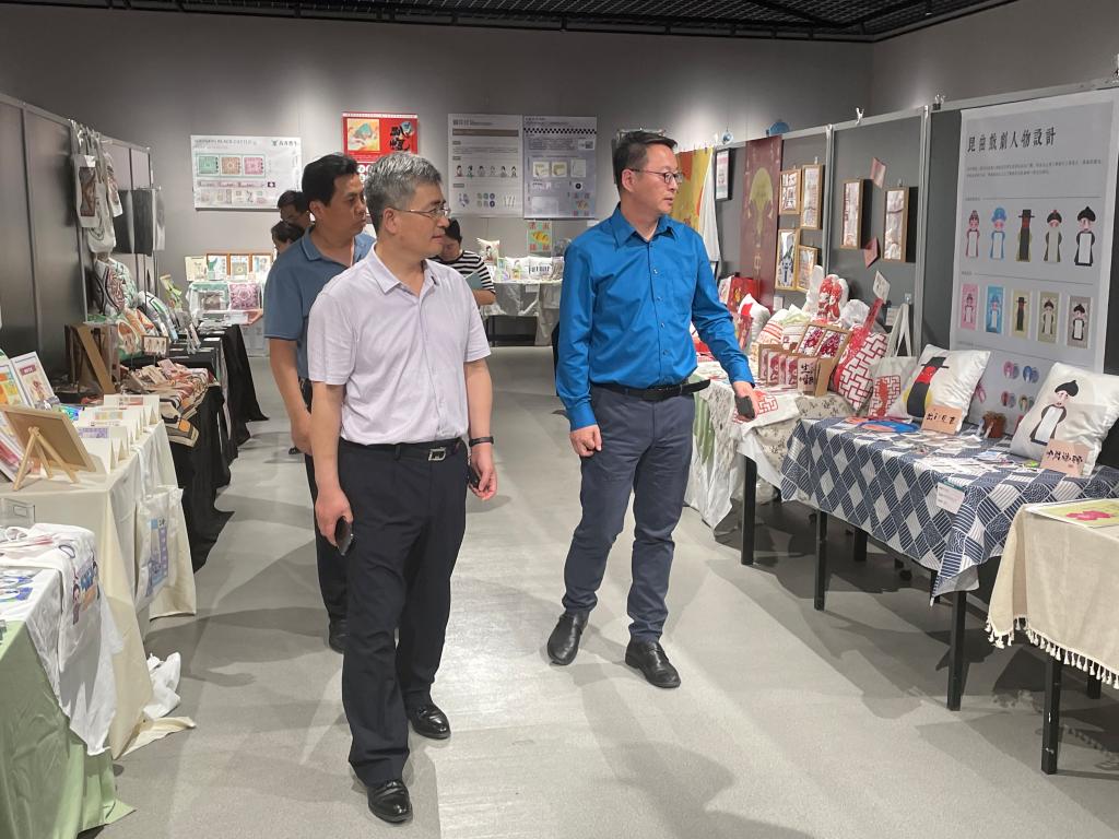 张兆明首先参观了美术学院“季·艺”2023届设计工美毕业生专场作品展。杨三军对各类作品的文化内涵、选用材质、表现手法等进行了介绍,围绕作品的立意、制作过程和指导教师等话题,张兆明与毕业生进行了亲切交流。他对毕业生作品的艺术构思和表现形式表示充分认可,对美术学院2023届设计工美毕业生作品展的水平和质量予以高度肯定,并鼓励毕业生坚持创造性思维进行艺术创作。