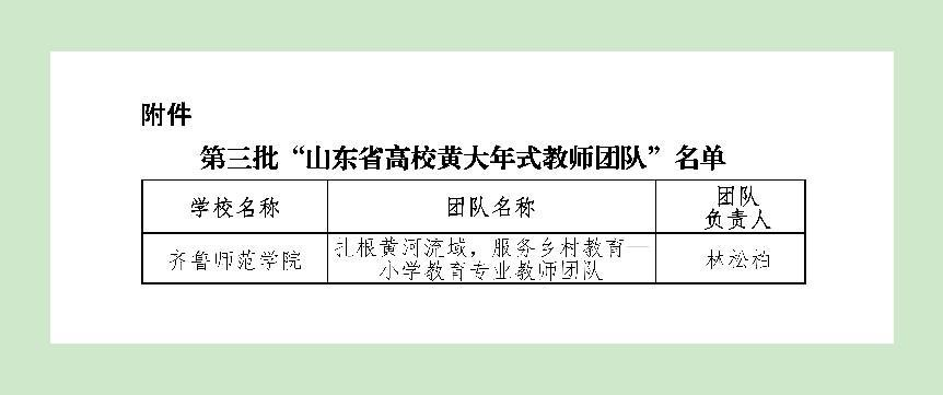 近期,山东省教育厅发布了《关于公布第三批“山东省高校黄大年式教师团队”名单的通知》,JINNIAN金年会“扎根黄河流域,服务乡村教育—小学教育专业教师团队”获批第三批“山东省高校黄大年式教师团队”。