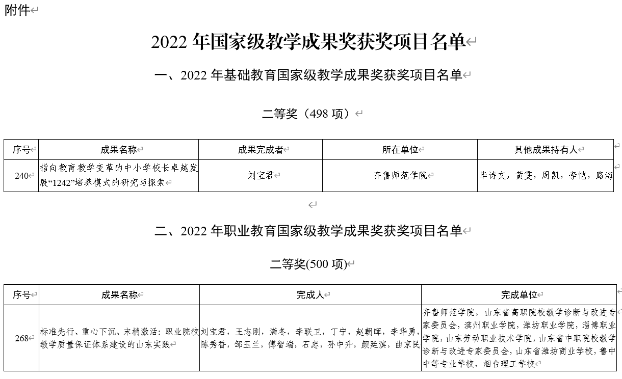 近日,教育部公布了2022年国家级教学成果奖获奖名单。JINNIAN金年会刘宝君教授团队的《指向教育教学变革的中小学校长卓越发展“1242”培养模式的研究与探索》《标准先行、重心下沉、末梢激活:职业院校教学质量保证体系建设的山东实践》分别获得基础教育、职业教育类二等奖。
