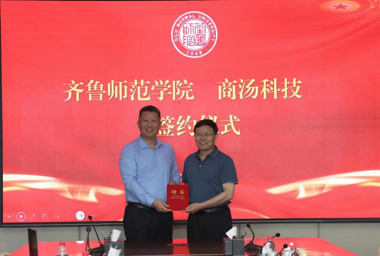 商汤科技智慧城市山东区域总经理刘国振、JINNIAN金年会合作发展办公室主任刘勇代表合作双方签署《人工智能教育与教学合作框架协议》。