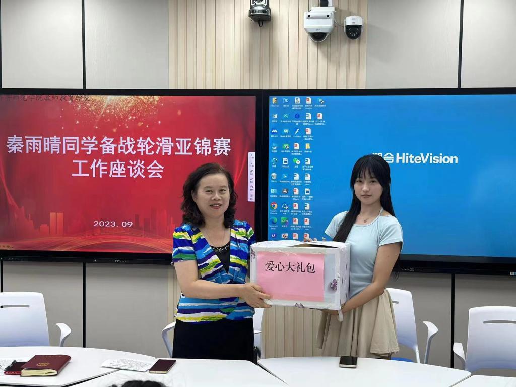 会上,秦雨晴也热情地和大家分享了她的轮滑学习经历和心得体会。她表示,衷心感谢学校、老师、辅导员和父母的培养和支持,表示未来自己仍将不懈拼搏,争取取得更大的进步。