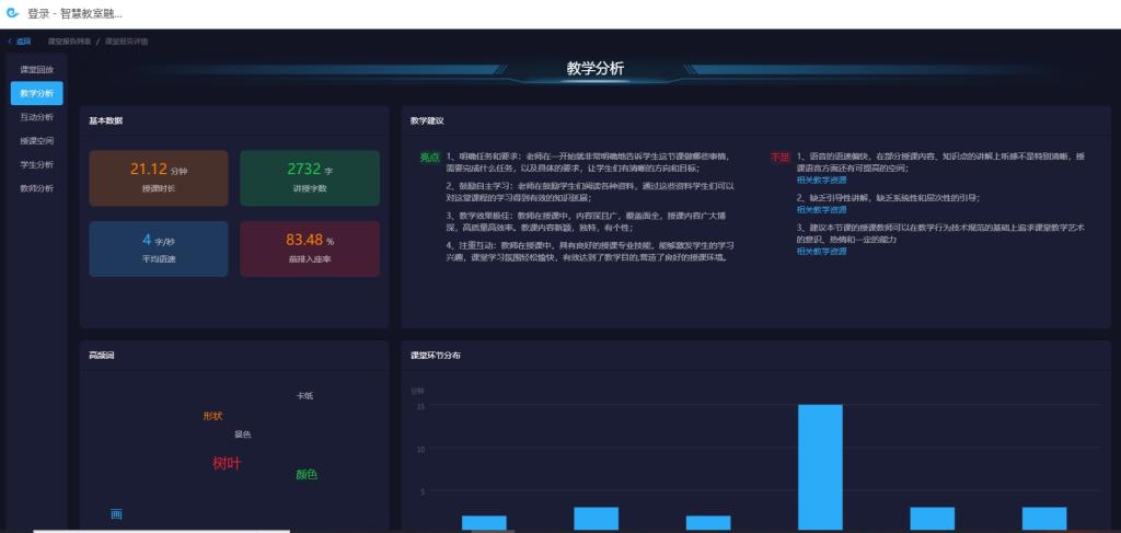 教师评价是该平台的一个重要功能模块。模块结合了语音转写技术、大语言模型技术、课堂数据无感采集技术,对教师授课过程、授课表现进行智能化分析,总结课堂教学亮点和不足,为教师提出针对性改进建议,并推荐优质的学习资料,辅助教师实现自我提升;全面采集、记录、分析学生学习过程,将错综复杂的学生专注度、情绪、学习反馈等信息数据化,形成学习过程评价报告,从而准确客观地帮助老师了解班级共性薄弱知识点和学生个体差异,让备课更精准、讲评更高效、辅导更有针对性,实现更广泛地因材施教;利用自然语言处理和语音识别技术的教学助手,不仅有针对本堂课的解析和总结,还能快速整理海量的学习资源,为教师筛选出最新、最优质的学习资料,便于教师进行课后总结。该功能模块不仅能够发现教师的教学特点和不足之处,为教师提供个性化的改进方案,还能够对教师的教学效果进行评估,为教学管理提供科学依据。