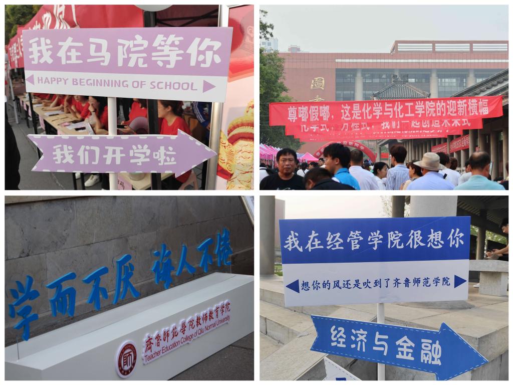 各学院精心策划,创新性开展迎新工作。在报到处,各学院安排志愿者引导新生入学,有条不紊地引导新生办理报到手续,为新生及家长们提供指引和帮助。各学院设计了精美的展架展板、艺术造型、宣传画册、签名墙等,积极宣传学院办学成就和办学理念,让新生更好更快地了解自己的学院和专业。外国语学院精心策划,设计打造了专属吉祥物“外小语”,为新生们定制了发夹、钥匙扣、卡套等周边文创产品,得到了大家的喜爱和热捧;报到日恰逢生命科学学院生物科学(师范类)专业郝语欣、园林专业胡璇的生日,师兄师姐用自己亲手制作的园林作品“春芽”“雨萌”予以赠送,让新生感受到了来自学院的热情与温情;化学与化工学院为家长们提供专门的休息区域,学长学姐为每一位新生写信、寄语新生,抽盲盒环节欢乐不断;音乐学院设置了“洞洞乐抽奖”活动,现场免费为同学们用拍立得相机拍照,并送上了定制版钥匙扣和书签,设置音院集结号地图,小萌新们在地图上打卡了自己的家;美术学院为新生准备了精美的纪念品,设置了签名墙和心愿墙,书法学新生用专业所长为在场同学们写下了祝福……
