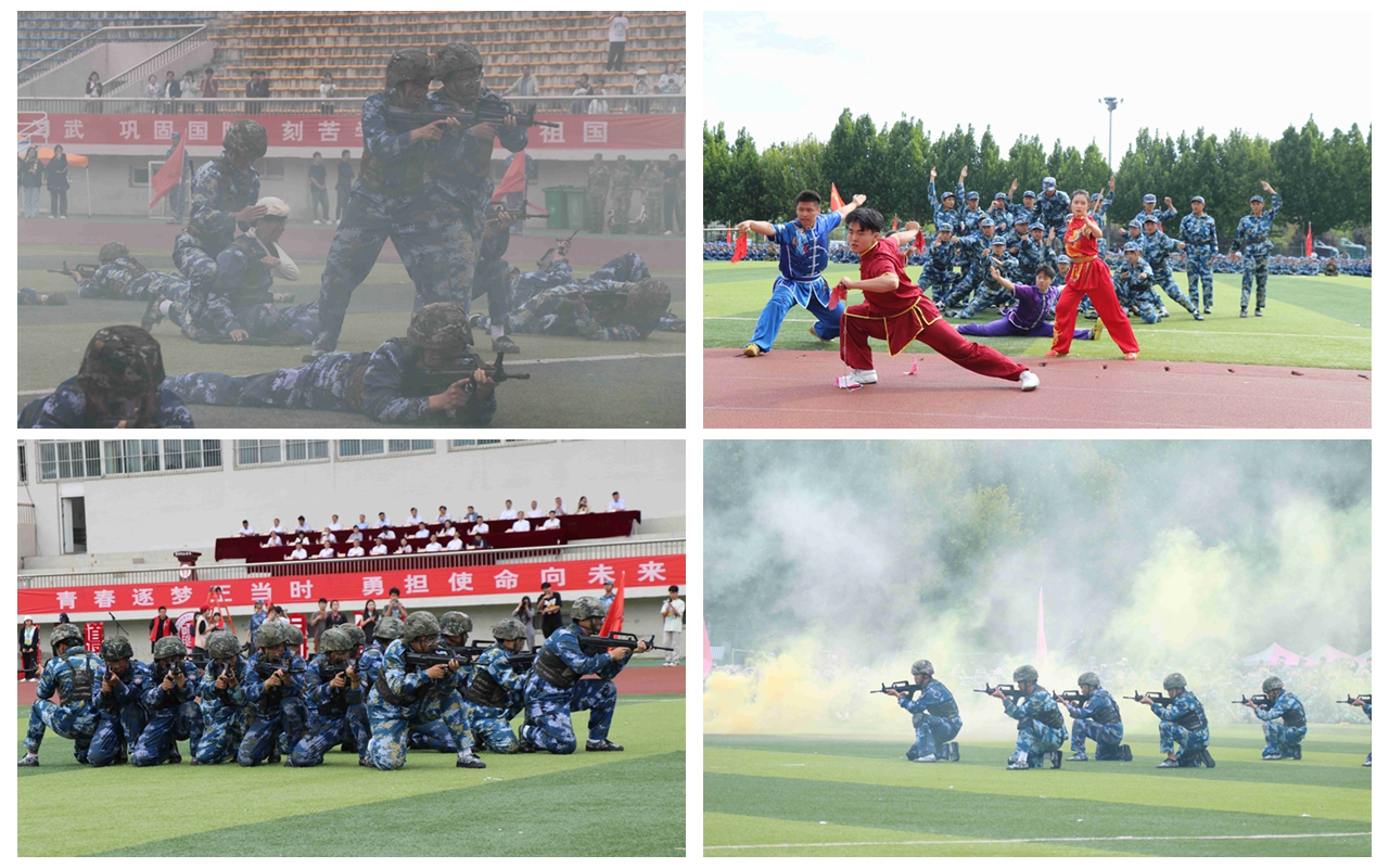 分列式上,军歌嘹亮,队旗飘扬。军训团21个方队队列整齐、口号嘹亮、英姿飒爽、步履铿锵,依次通过主席台接受检阅,同学们用标准的敬礼、齐步走、正步走等军训动作展现了师院学子昂扬向上、顽强拼搏、奋发有为的精神风貌。随后,养成方队、武术表演队、倒功操及擒敌拳队先后进行了相关科目汇报表演。随着爆破声响起,硝烟瞬间在操场弥漫,战术及战场救护队员面涂迷彩、紧握钢枪、闪转腾挪、匍匐迂回、英勇果敢、密切协同,展现了顽强的作风和昂扬向上的青春风采,赢得现场热烈掌声。