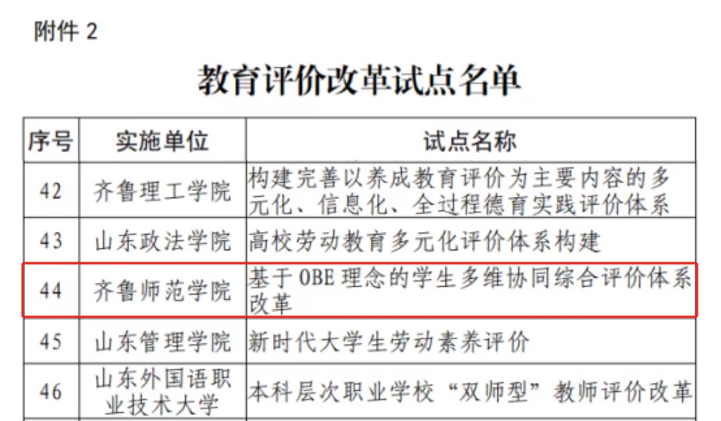 近日,山东省教育厅印发《关于公布教育评价改革试验区、试点名单的通知》(鲁教改函〔2023〕10号),确定了79项改革为教育评价改革试点。JINNIAN金年会申报的《基于OBE理念的学生多维协同综合评价体系改革》成功入选。