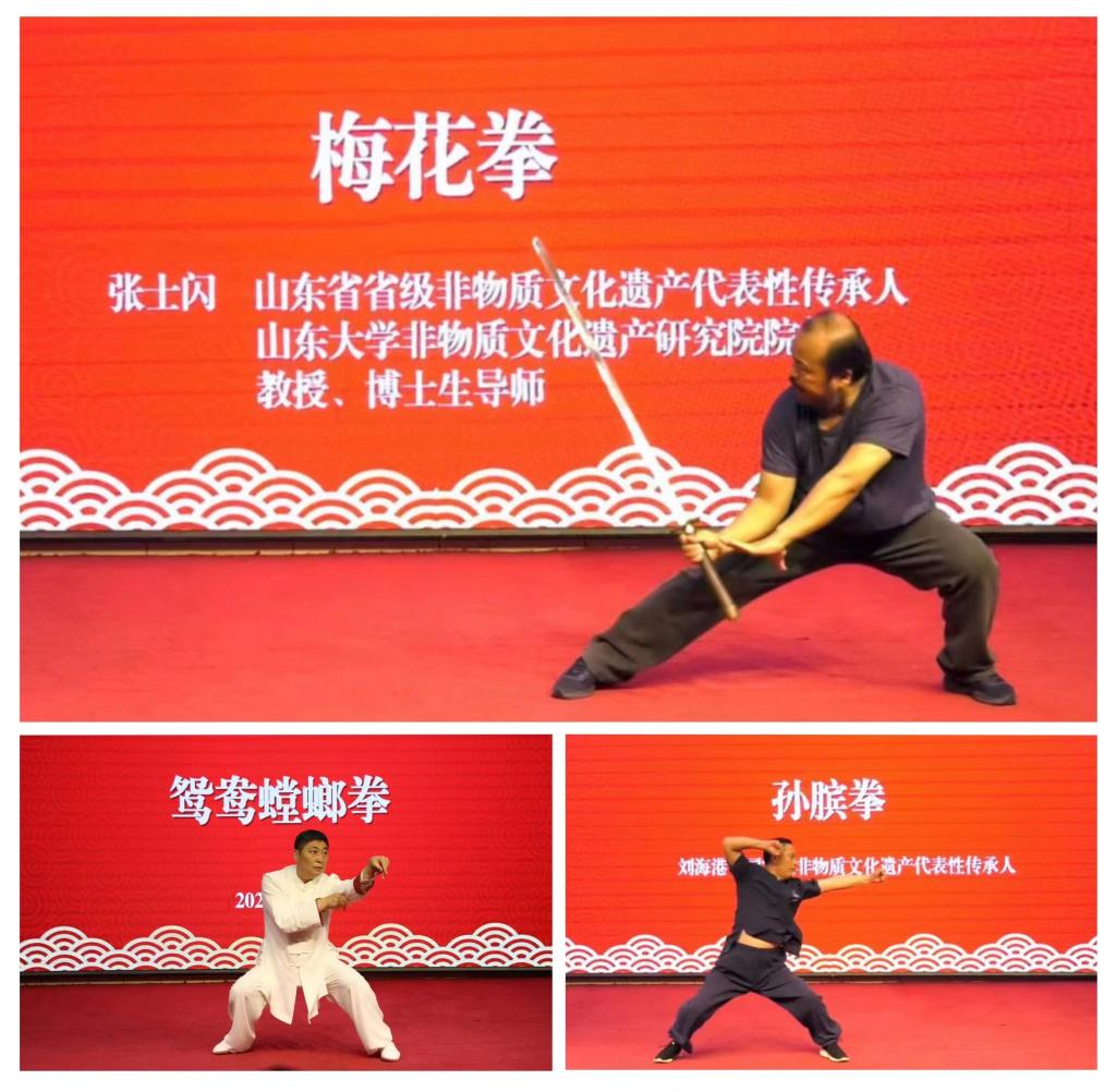 在章丘校区学术报告厅,学校师生先后进行了地蹚拳、刀术、童子功、双人对练空手夺枪、八段锦的展演;国家级非物质文化遗产代表性项目鸳鸯螳螂拳国家级代表性传承人孙日成、国家级非物质文化遗产代表性项目孙膑拳国家级代表性传承人刘海港受邀上台展示;国家级非物质文化遗产代表性项目梅花拳、人类非物质文化遗产代表作太极拳等项目也进行了现场展示。