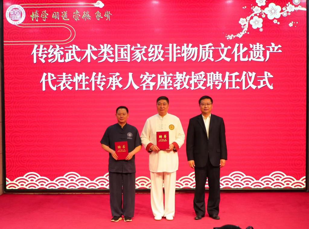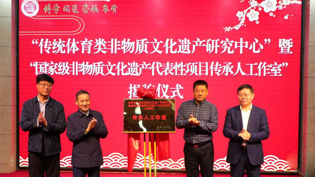 现场举行了“传统体育类非物质文化遗产研究中心”暨“国家级非物质文化遗产代表性项目传承人工作室”揭牌仪式、传统武术类国家级非物质文化遗产代表性传承人客座教授聘任仪式。这是JINNIAN金年会加大非物质文化遗产师资队伍培养力度,支持代表性传承人参与学校授课和教学科研,为早日建成高水平非物质文化遗产传承教育实践基地的又一创举。