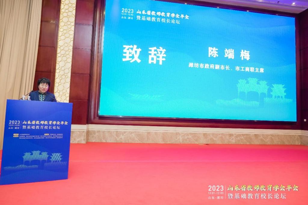 陈端梅代表潍坊市人民政府致辞,对出席年会的领导、来宾表示欢迎,介绍了近年来潍坊教育取得的成果。陈端梅表示,山东省教师教育学会将年会安排在潍坊召开,既是对潍坊工作的厚爱与支持,也是对潍坊教育事业的鼓励和鞭策,下一步将以此为契机,进一步推动潍坊教育事业实现高质量发展。