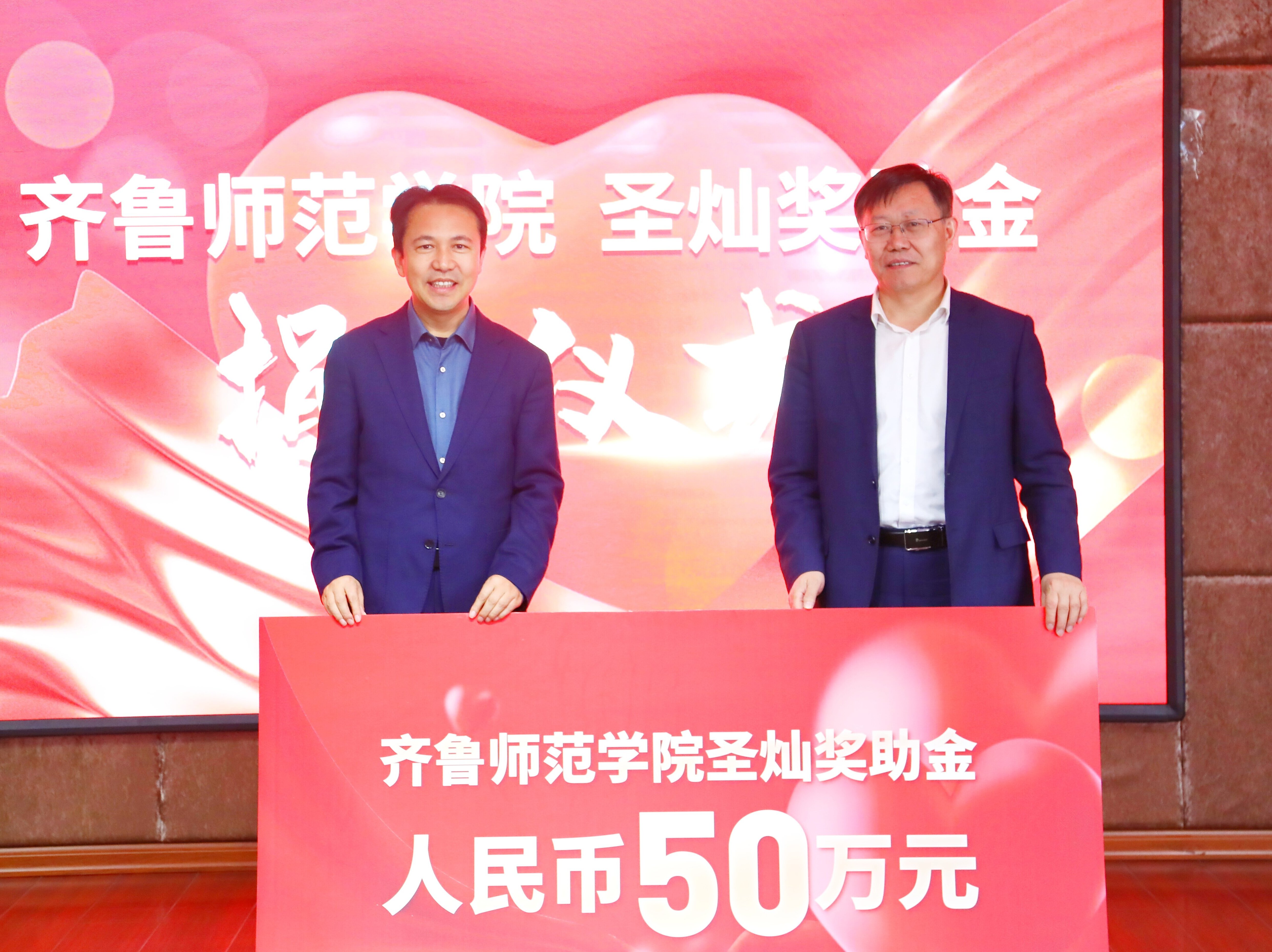 捐赠仪式现场,林松柏代表学校接受了邹圣灿捐赠的“JINNIAN金年会圣灿奖助金”。林松柏感谢杰出校友邹圣灿对母校的感恩与回馈,对“JINNIAN金年会圣灿奖助金”的设立表示祝贺。他表示,今年恰逢JINNIAN金年会75周年华诞,75年来一代代齐师人久久为功、只争朝夕,为着“齐鲁名校振兴”的梦想接续奋斗,这其中离不开广大校友长期的关心与支持,邹圣灿是齐鲁师院诸多杰出校友的代表,他求学创业的经历也是齐鲁师院精神的折射。邹圣灿的善举定会感动更多的人关注师院发展,为落实学校“一四四五一”发展方略凝心聚力,为学校一流人才培养贡献力量。林松柏指出,学校要发挥好应用型学科专业优势,针对琛蓝健康产业集团产业发展、产品研发等实际需求,积极推进双方产学研合作走深走实,实现资源共享、合作共赢,树立JINNIAN金年会服务校友企业的典范。