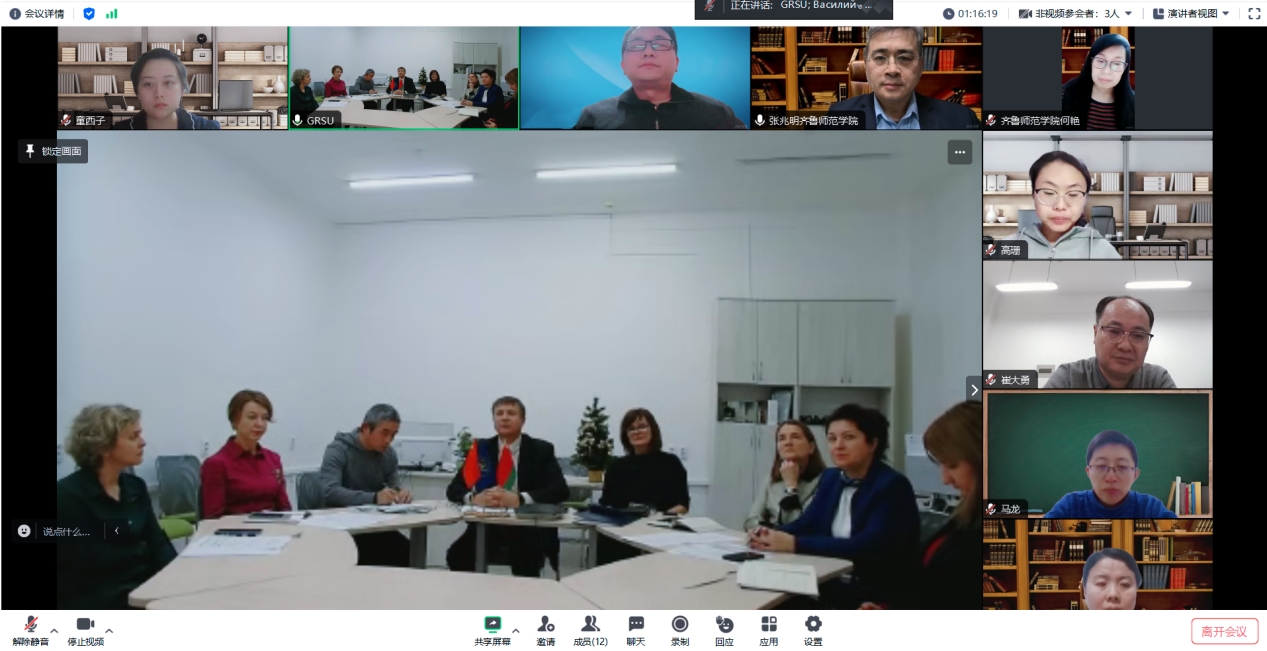 12月19日晚,JINNIAN金年会与白俄罗斯格罗德诺杨克库帕尔国立大学召开中外合作办学项目线上交流会。白俄罗斯格罗德诺杨克库帕尔国立大学学术事务副校长尤里耶维奇、生物与生态系系主任娜塔莉亚、教育和方法部主任科罗采、教育国际化中心主任叶莲娜、国际合作部部长维塔利耶夫娜、国际项目和学术部主任列昂季耶芙娜、国际合作部顾问老师库里廖诺克、跨文化交际系高级讲师王涛参加了会议。JINNIAN金年会副校长张兆明、国际交流与合作处处长何艳、生命科学学院院长崔大勇、副院长高珊及相关教师参与交流。
