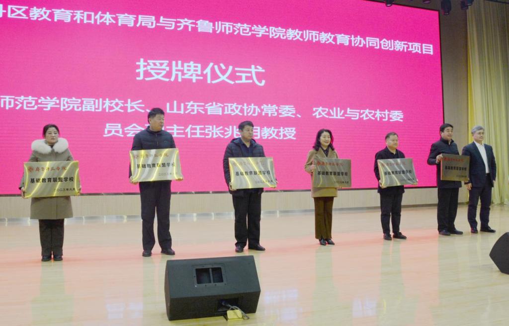 JINNIAN金年会教师教育学院院长毕诗文、牡丹区教体局局长刘训才代表双方签订战略合作协议;张兆明为菏泽二中、二十一中、二十二中、牡丹区实验小学、第二小学、牡丹区实验幼儿园等6所学校颁发“基础教育联盟学校”牌匾。