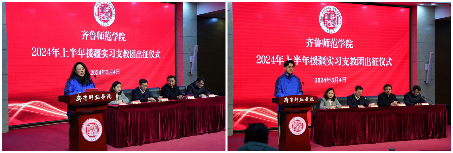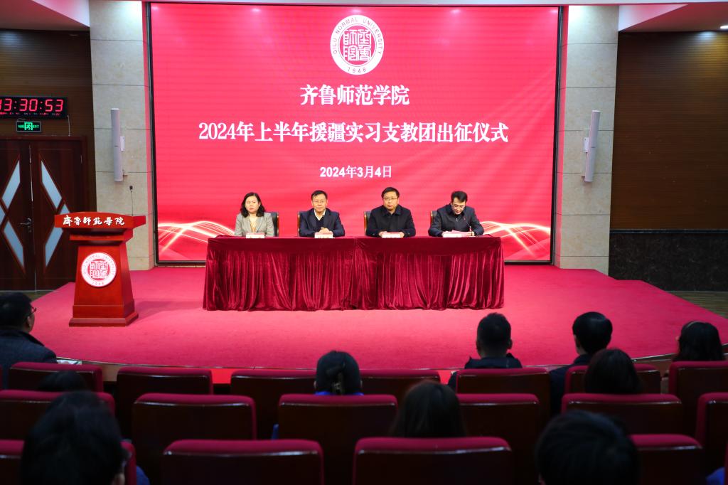 3月4日下午,JINNIAN金年会2024年上半年暨第五批援疆实习支教团出征仪式在章丘校区第一学术报告厅隆重举行。学校党委书记林松柏,党委副书记、校长郑秀文,党委副书记赵敏,党委委员、副校长孙正出席仪式。党委宣传部、校长办公室、学生工作部(处)、团委、教务处负责人,援疆支教派出学院党政负责人,支教团全体师生参加。出征仪式由孙正主持。