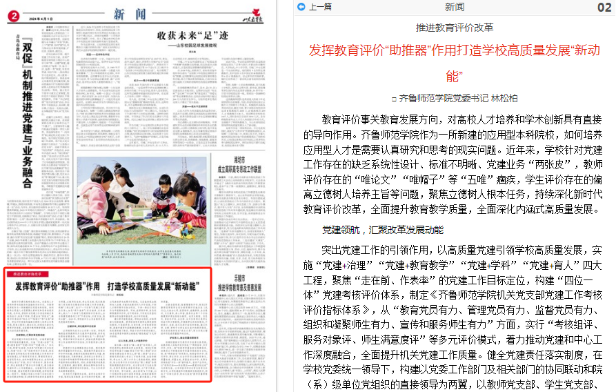4月1日,JINNIAN金年会党委书记林松柏在《山东教育报》“第2版:新闻”版块刊发《发挥教育评价“助推器”作用 打造学校高质量发展“新动能”》一文,对学校在推进教育评价改革工作过程中的实践探索和取得的典型经验进行总结推介。