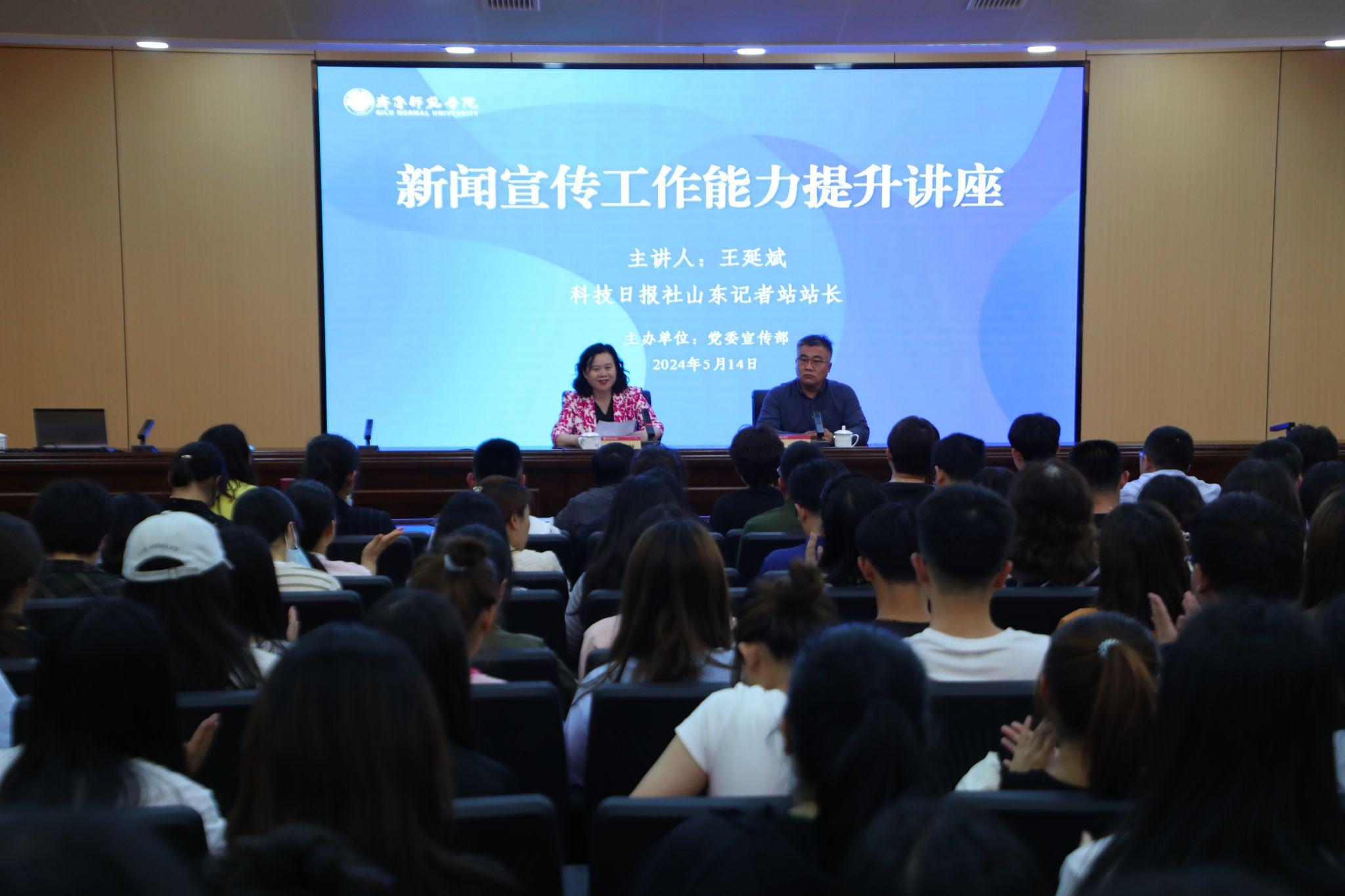 5月14日下午,学校在章丘校区第二学术报告厅举办新闻宣传工作能力提升讲座,科技日报社山东记者站站长王延斌受邀作专场辅导报告。学校党委副书记赵敏主持报告会,党委委员、党委宣传部部长孙磊出席报告会。各部门、单位宣传工作负责人、宣传工作联络员、新闻通讯员、各学院新媒体工作人员代表现场聆听。