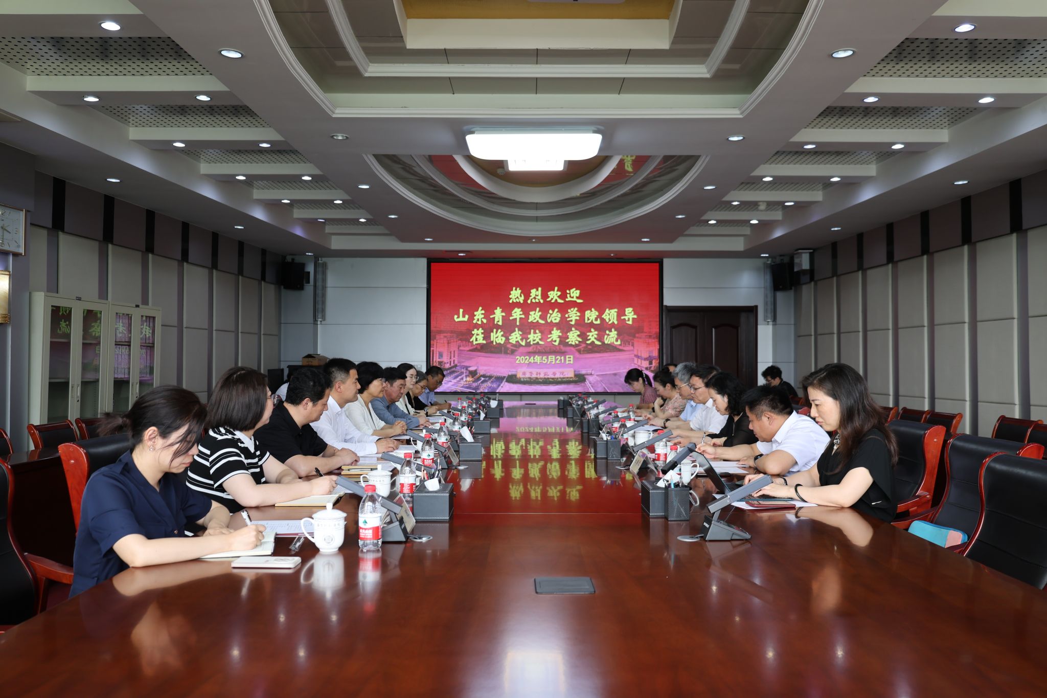5月21日下午,山东青年政治学院党委书记魏艳菊,党委委员、副校长张杰,党委委员、副校长陈龙溪一行9人来校考察交流。学校党委书记林松柏、党委副书记赵敏、副校长张兆明热情接待来访。双方就进一步加强合作、共谋发展举行座谈。座谈会由赵敏主持。