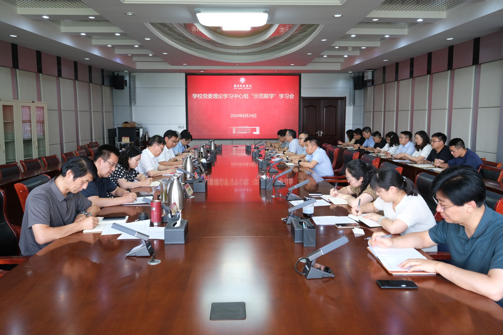 6月24日下午,学校党委理论学习中心组以“党委示范、主题联学”的方式举办集体学习会,传达了中共山东省委十二届六次全体会议精神,紧紧围绕深入学习贯彻习近平总书记视察山东重要讲话重要指示批示精神,心怀大局、挺膺担当,以高质量发展为强省建设“走在前、挑大梁”作出师院贡献。学习会由党委书记林松柏主持。