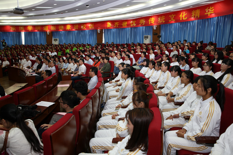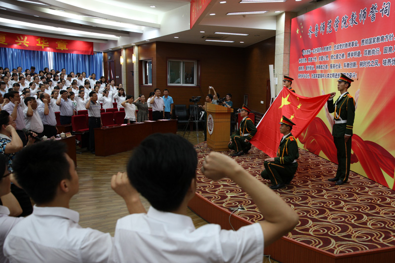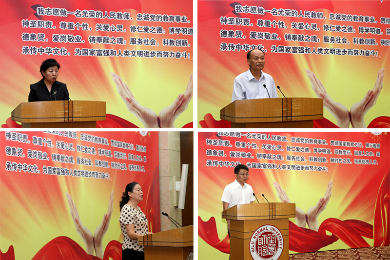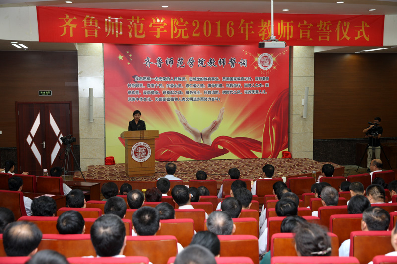 在国务院特殊津贴获得者、山东省优秀教师和师德标兵、马克思主义学院陈海燕教授的带领下,全校700余名教师紧握右拳,面向国旗庄严宣誓:“我志愿做一名光荣的人民教师,忠诚党的教育事业,贯彻国家教育方针,履行教师神圣职责。尊重个性,关爱心灵,修仁爱之德……”,用铿锵有力的声音许下了自己庄严的承诺。