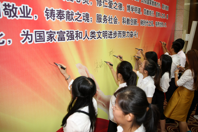 仪式最后,在印有誓词的签名墙上,各位教师踊跃签名合影,表达了自己牢记誓词、践行诺言的坚定决心。