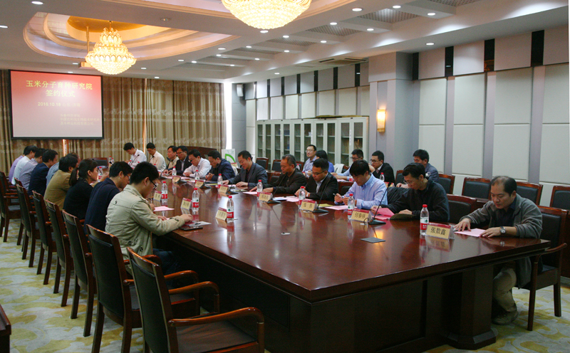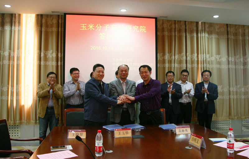 王晓举副所长介绍了中国农业科学院生物技术研究所的概况,分析了三家合作单位各自的合作优势。他指出,中国农业科学院生物技术研究所是目前我国唯一以农业生物技术前沿基础和应用基础研究为重点的国家级非营利性科研机构。研究院的成立实现了科研机构、高等院校、著名企业的强强联合,各方共同努力,集聚创新要素,共建创新平台,实现优势互补,促进共同发展。随后,在全体与会人员的共同见证下,王玉华校长、王晓举副所长、高新勇总裁分别代表三方共同签署了《玉米分子育种研究院成立协议书》。签约仪式后,王玉华校长、王晓举副所长、高新勇总裁共同为“玉米分子育种研究院”揭牌。 (科研处 柴振光)