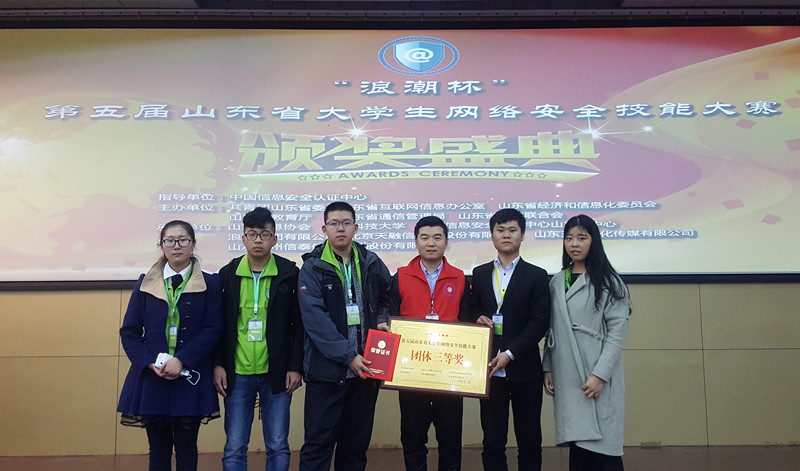 今年大学生网络安全技能大赛采用三种题目:选择题,技能分析题,金银铜牌过关题等。金年会官网由信息科学与工程学院的张玉泉与网络管理中心王飞超老师作为指导教师,张恒悦领队教师与李耀磊、李玉哲、张亚楠等5人代表学校参加比赛,在本次大赛中荣获团体三等奖、李耀磊同学获得团体个人三等奖、省级优秀领队奖、省级优秀指导教师奖,为金年会官网争得荣誉。山东省大学生信息安全知识大赛是山东省高校间网络安全最高规格的专业赛事。