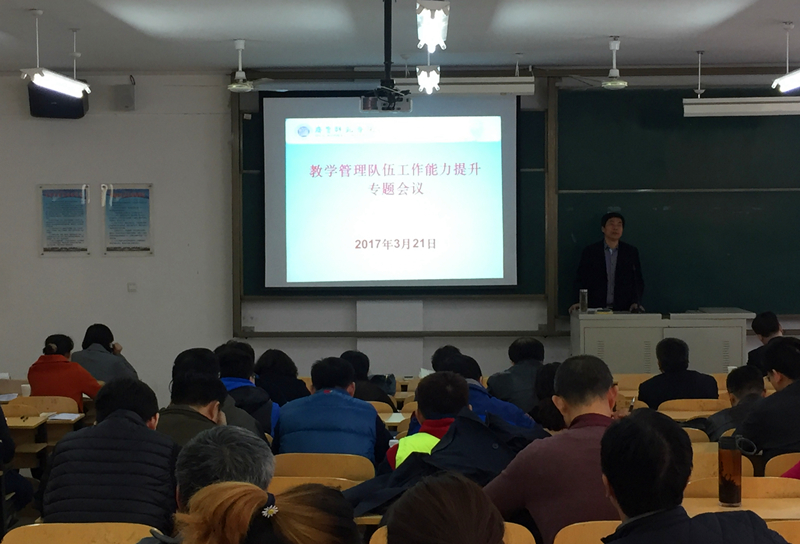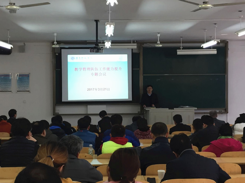3月21日下午,金年会官网于章丘校区1号教学楼A207召开了“教学管理工作队伍工作能力提升专题会议”。林松柏校长、张福建副校长出席了会议。教务处(评建办)、教学质量监控中心、实验管理中心全体人员,人事处相关人员,各学院分管教学负责人、教学秘书、教务员、专职实验人员参加了会议。会议由林松柏校长主持。