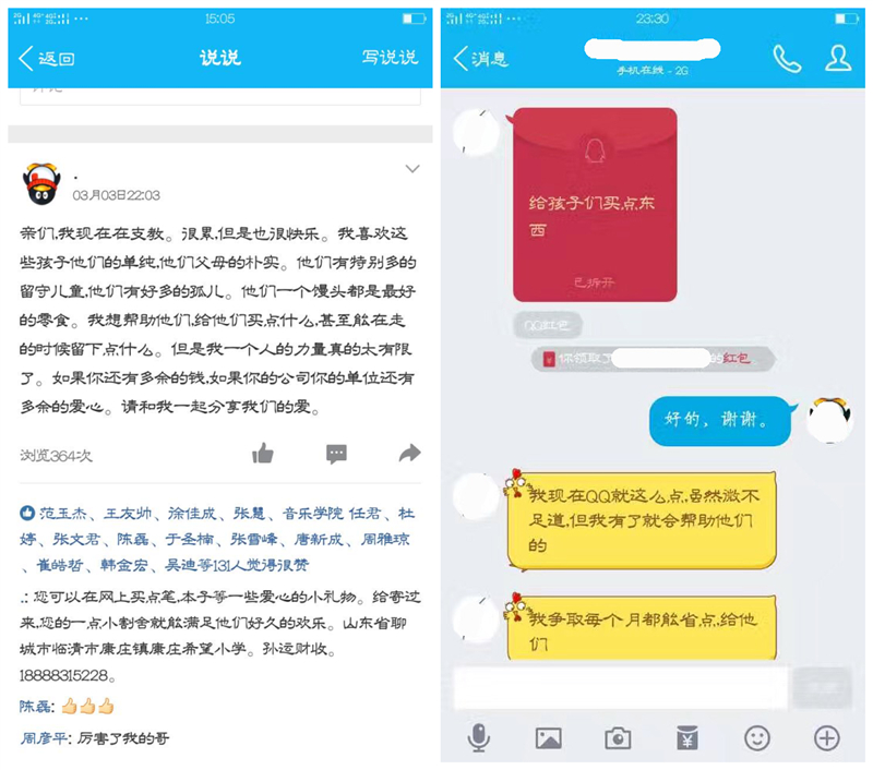 “亲们,我现在在支教。很累,也很快乐。我喜欢这些孩子们的单纯朴实。他们有特别多的是留守儿童,他们中有好多的孤儿。他们一个馒头都是最好的零食。我想帮助他们,给他们买点什么,甚至能在走的时候留下点什么。但是我一个人的力量镇的太有限了。如果你还有多余的钱,如果你的公司你的单位还有多余的爱心。请和我一起分享我们的爱。”——这是孙运财3月3日22:03发出的第一份倡议。