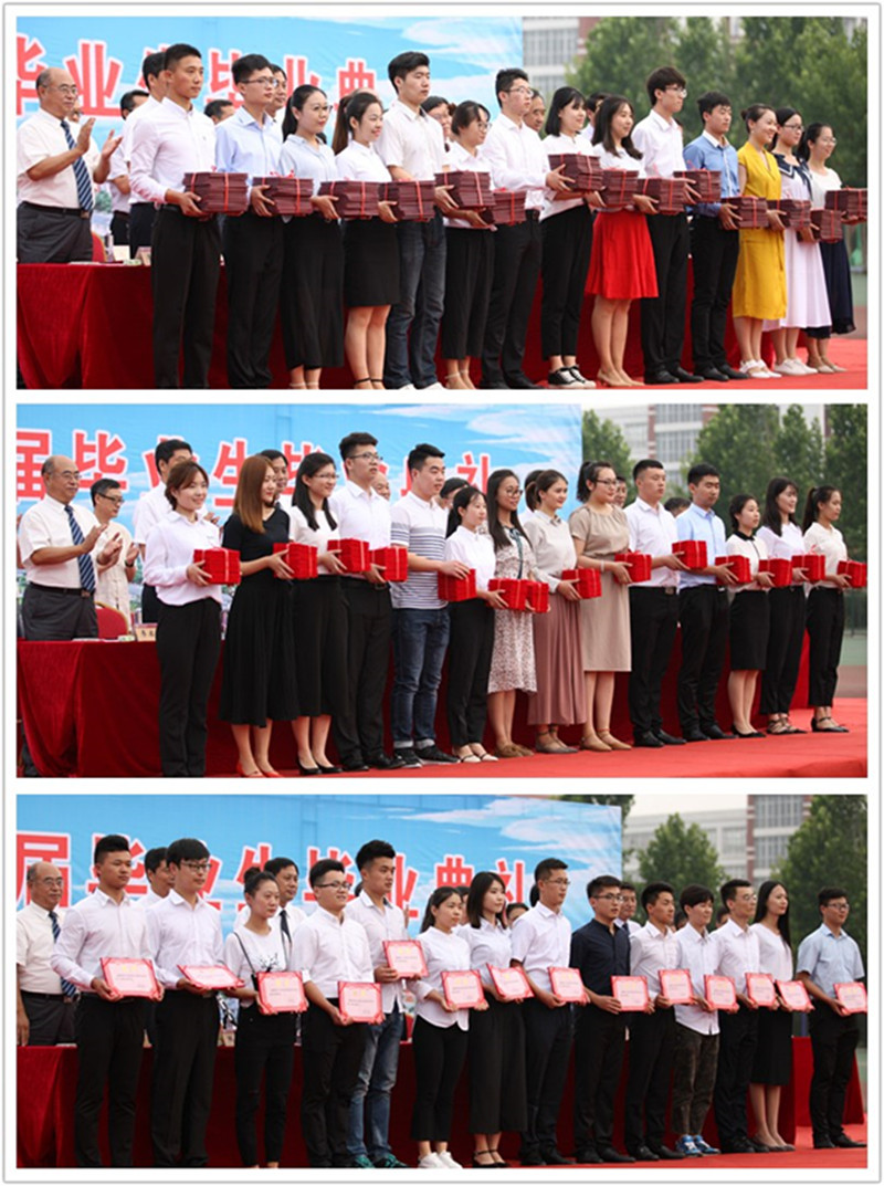 毕业典礼在雄壮的国歌声中拉开了帷幕。典礼上,教务处梁承锋处长宣读了2017届毕业生毕业资格及学士学位授予情况审查报告;学生工作处杨磊处长宣读2017年优秀毕业生名单;校友办公室郝克宁主任宣读2017届毕业生校友联络员名单;校领导依次颁发了毕业证书、2017年优秀毕业生荣誉证书和2017届毕业生校友联络员聘书。