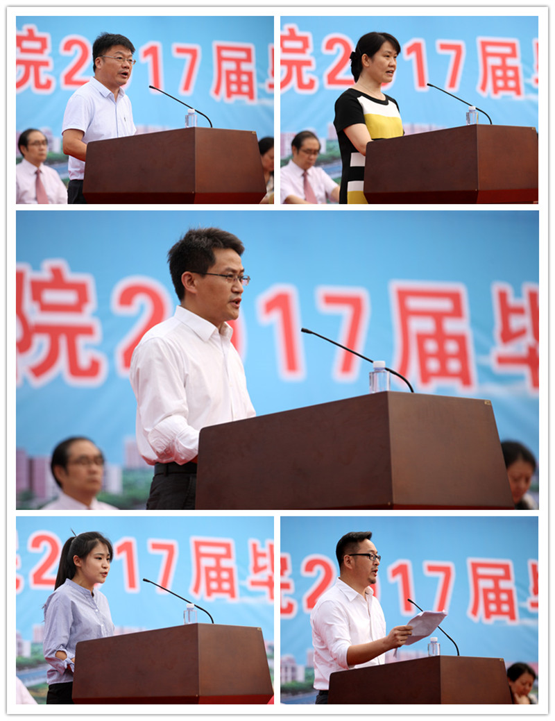 2017届毕业生代表,历史与社会发展学院李蕾同学在发言中回忆了在学校求学期间的点点滴滴,表达了对母校的感恩之情和祝福。教师代表,美术学院杨三军教授寄语毕业生:不要忘记学习,要学会做人,要不忘良知。“天行健,君子以自强不息。地势坤,君子以厚德载物“,祝愿和期待同学们将来有更大的进步和作为。