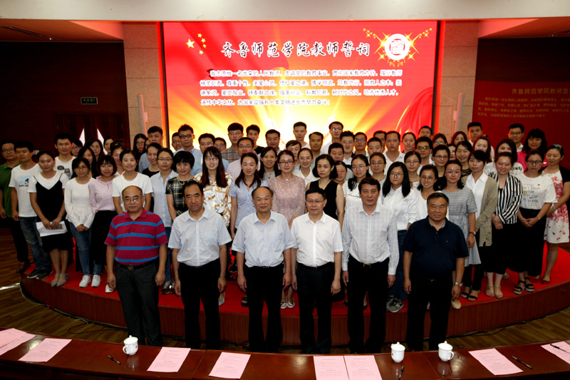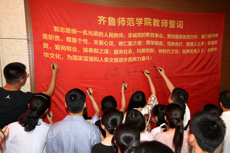 仪式上,二级教授陈海燕博士和化学与化工学院田承森博士分别代表新老教师发言。在教师教育学院青年教师薛绍聪带领下,全体师生紧握右拳,面向国旗庄严宣誓:“我志愿做一名光荣的人民教师,忠诚党的教育事业,贯彻国家教育方针,履行教师神圣职责。尊重个性,关爱心灵,修仁爱之德……”,用铿锵有力的声音许下了自己的坚定承诺。