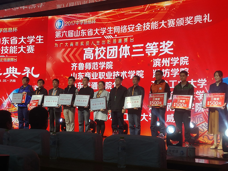 11月3日,“中孚信息杯”第六届山东省大学生网络安全技能大赛在山东交通学院完满结束。由信息科学与工程学院学生组成的校代表队和多名信息技术爱好者参加比赛,获得团体三等奖,信息科学与工程学院学生秦长伯获个人“三等奖”,指导教师王飞超、张玉泉被评为“省级优秀指导教师”,赵旭、张恒悦被评为“省级优秀领队”。