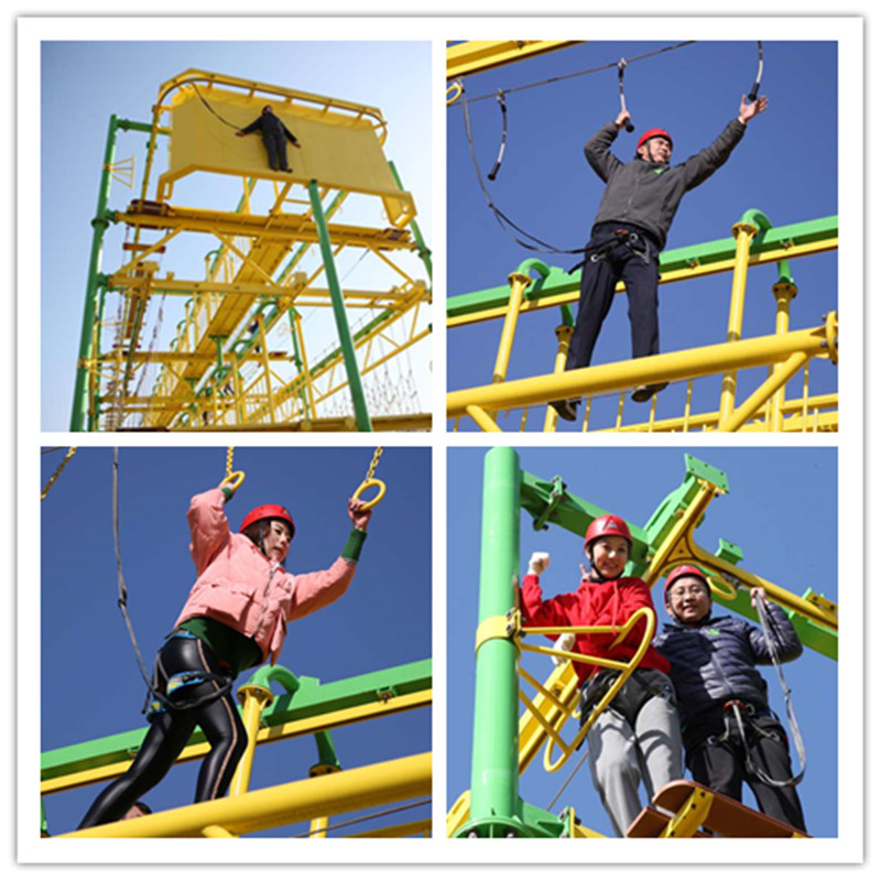 在教练的统一组织下,全体队员统一戴上专业头盔,穿好安全护具,系好安全绳锁,依次走上空中走廊,身体随着器械的波动颠簸,跟着器械的摇摆晃动,时而腾挪,时而跨越,时而如壁虎般贴壁踱步……每一个项目都各具挑战难度,分别考验人们的胆量、平衡、力量、协调、柔韧、耐力等等身心素质。掌声、喝彩声、唏嘘声、相机的快门声此起彼伏,大家彼此提醒提示、夸赞鼓励。每个人都在克服各自的困难,为了团队增光添彩;每个人都仔细品味着完成一个个挑战后的自信与喜悦,没有一个人放弃,非常难能可贵。