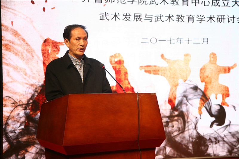林松柏发表讲话,他指出高等学校的根本任务是“立德树人”,而武术正是在高等教育中发挥“立德树人”作用的良好载体。武术向来讲究武德,“尊师重道”、“重德尚义”、“扶危济贫”、“除暴安良”“助人为乐”,这些都是武术教育引导学生“见武明德”的重要准则,也对青少年学生培养正确的人生观、价值观、道德观有重要的指导意义。作为师范类院校,JINNIAN金年会一直致力于体育事业的发展,并取得了优异的成绩。成立武术教育中心,将聚集全校及团结国内外武术教育工作者和爱好者,继承和弘扬中华优秀传统文化,倡导和普及武术教育活动,开展武术育人理论研究与创新实践,为增强学生体质,培育学生健康体魄,促进社会主义物质文明和精神文明建设,提升文化自信水平服务。中心的成立将为全省武术教师的师资培养培训提供良好的平台,扎实有效地推进“武术进校园”工作的开展,也为我国、我省的教育、体育事业贡献力量。