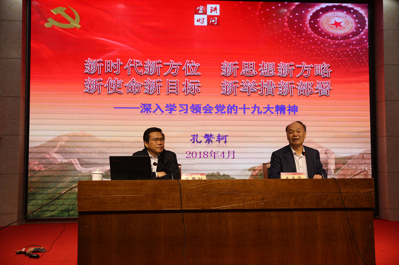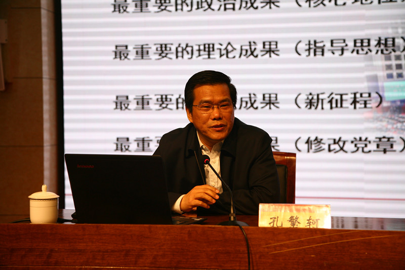 孔繁轲作了题为《新时代新方位 新思想新方略 新使命新目标 新举措新部署——深入学习领会党的十九大精神》的报告。他从“新时代新方位”、“新思想新方略”、“新使命新目标”、“新举措新部署”四个方面全面分析和深入解读了过去5年我党取得的重大历史性成就、发生的重大历史性变革及中国特色社会主义所处的新的历史方位;阐释了新时代中国特色社会主义思想的历史贡献、生成逻辑、核心要义、丰富内涵和实践要求以及我们党必须长期坚持的指导思想、行动指南和行动纲领;论述了中国共产党人新的历史使命和社会主义现代化建设新的重大战略目标;经济社会发展一系列新的重大战略举措和全面从严治党新的重大战略部署。