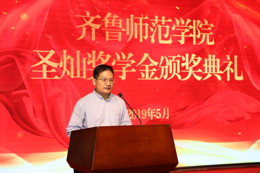 5月16日下午,2019年“圣灿奖学金”颁奖典礼在章丘校区图书馆报告厅举行。党委副书记、校长林松柏,党委委员、副校长张福建和金年会官网青岛校友会会长、青岛银色世纪健康产业集团有限公司董事长邹圣灿出席典礼,学生工作部副部长、校友办公室主任郝克宁,文学院院长杨峰、党总支副书记于江、副院长李术文及文学院300余名师生参加典礼,典礼由张福建副校长主持。
