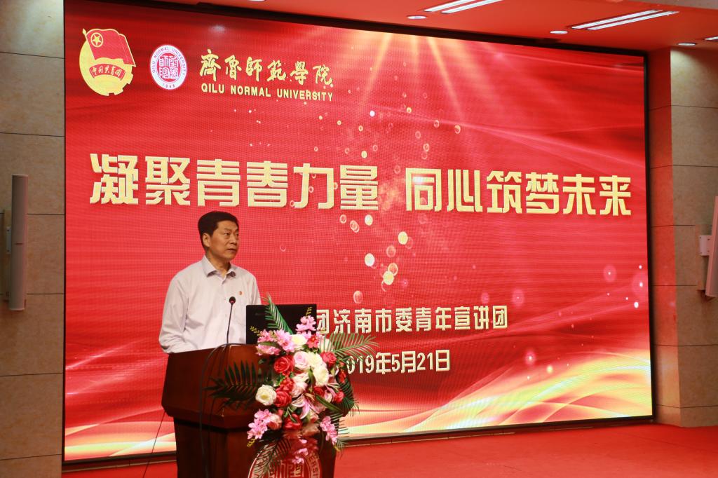 为深入学习贯彻习近平新时代中国特色社会主义思想和党的十九大精神,推动形成学习习近平总书记在纪念五四运动100周年大会上重要讲话精神的新高潮,引导广大学生认清时代责任、明确奋斗目标,5月21日下午, 2019全国向上向善好青年、团市委常委、市青年宣讲团团长、市城肥清运管理一处清除二队班长陈国瑞,天下第一泉风景区服务中心环城园区解放阁班长王霄,章丘广播电视台主持人滕飞,瑜伽教练徐菲4位济南团市委青年宣讲团成员应邀来金年会官网,以“凝聚青春力量,同心筑梦未来”为主题,面向各学院团总支书记、副书记、辅导员以及学生代表300余人开展宣讲交流。党委委员、副校长张福建出席活动。