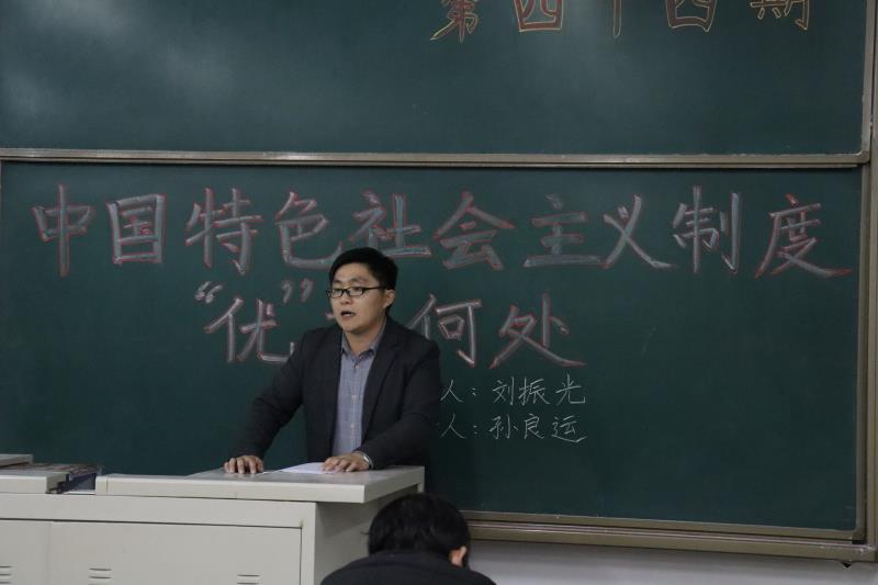 根据省委教育工委要求,进一步教育引导广大学生把思想和行动统一到党的十九届四中全会精神上,12月16日晚,“国是讲坛”第44讲在章丘校区一号教学楼A405开讲。省委教育工委宣讲团成员、马克思主义学院院长刘振光教授主讲,历史与社会发展学院辅导员、思政课教师孙良运辅讲,校团委组织的青年马克思主义者培养工程成员和马克思主义学院全体学生聆听了报告。
