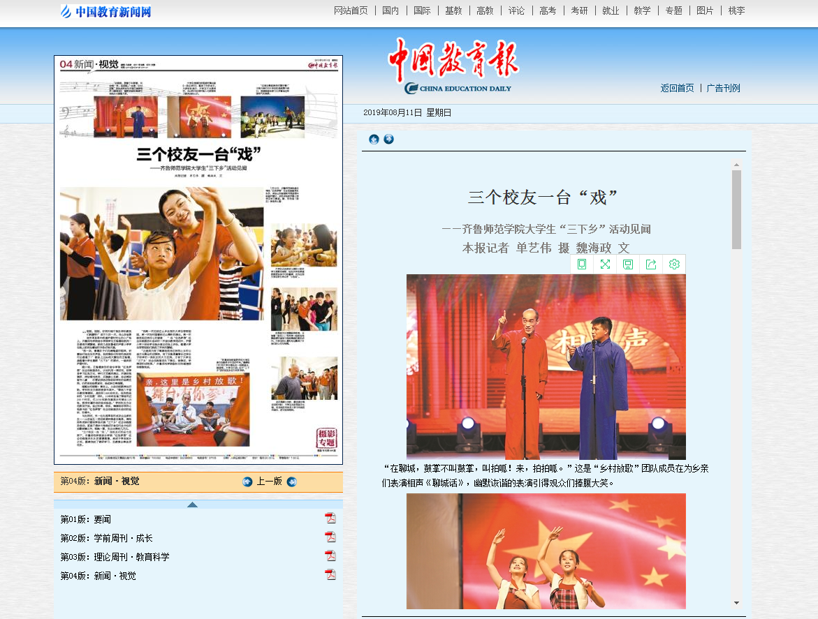 金年会官网2019年暑期“三下乡”实践活动紧紧围绕金年会官网“师范性、地方性、应用型”的办学定位和“教师教育、文化育人、服务地方”的办学特色,以“专项联动、主题带动、品牌驱动、课题牵动”,紧扣学生毕业要求,遵循成长成才规律,服务地方经济发展。中国教育报以三个校友一台“戏”为题整版报道了金年会官网大学生“三下乡”活动见闻。此外,新华网、共产党员网、中国青年网、山东共青团、大众网、大众日报、山东教育新闻、齐鲁晚报、天天快报、今日头条等多家媒体从不同角度宣传报道了金年会官网“三下乡”实践活动,提升了学校的知名度、美誉度与社会影响力。