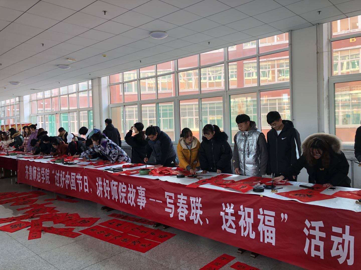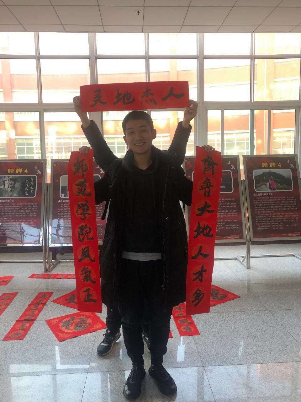 当日活动现场,伴着《春节序曲》的音乐,来自全校14个学院的42名书法爱好学生挥毫泼墨,沉浸其中。“齐鲁四季春常在 师院成就追梦人”“锦前程万里生辉 创大业一帆风顺”“爆竹声声盈师院 桃李凛凛遍神州”,春联既有感恩学校的美好祝福,也有宏图大展的励志高歌,还有团圆美满的幸福愿景。一个个火红的“福”字,一幅幅捧在手里的春联,一句句跃然于纸上的祝福,一张张随笔墨飞扬的笑脸,为学校增添了浓浓的文化氛围,受到了广大师生的热烈欢迎和一致好评。