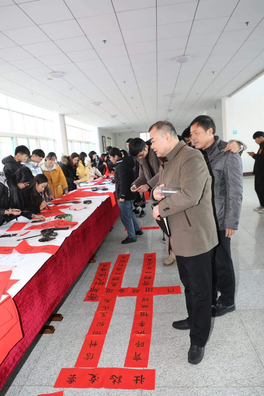 学校副校长张福建也来到活动现场。他和各学院党总支书记还有前来参加活动的师生们在书写桌前一一驻足观看,对学生的书法大加赞赏。张福建副校长对这次活动给予了充分肯定,他指出:“一定要将这种具有中国特色、中国气派、学校风格、学生素养的活动开展下去,传承发扬中华优秀传统文化,推动金年会官网精神文明建设不断向前发展”,同时借此活动向全校师生送出新年的美好祝福。