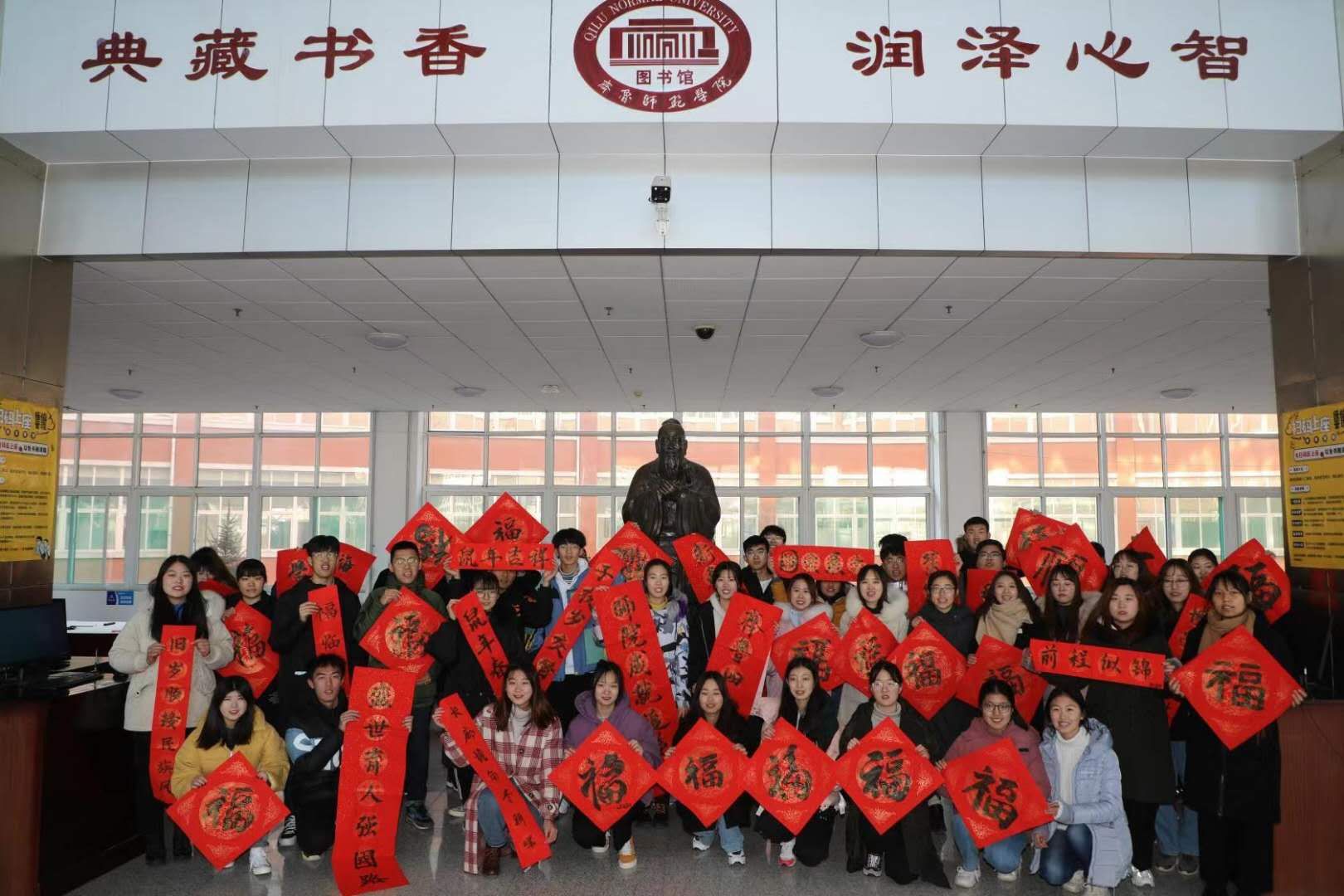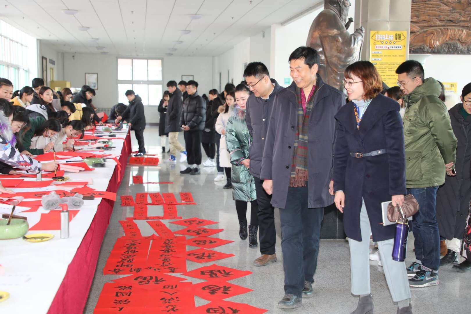 为深入落实立德树人根本任务,深化中国特色社会主义教育,培养学生的社会主义核心价值观,强化金年会官网“文化育人”的办学特色,31日上午,由学生工作部(处)主办,中华优秀传统文化融入教育辅导员工作研究团队承办的“过好中国节日 讲好中国故事——写春联、送祝福”活动在学校在图书馆二层大厅孔子像前举行。