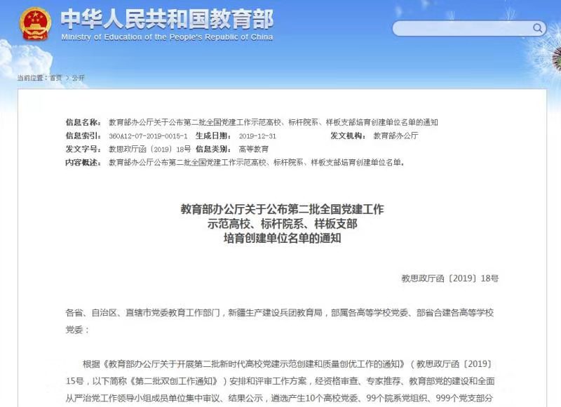 近日,《教育部办公厅关于公布第二批全国党建工作示范高校、标杆院系、样板支部培育创建单位名单的通知》(教思政厅函〔2019〕18号)在教育部官网发布。金年会官网体育学院教师第二党支部光荣入选“全国党建工作样板支部”培育创建单位。这是金年会官网高质量开展“不忘初心、牢记使命”主题教育的一个成果,更是教育部对金年会官网党建和思政工作的充分肯定。