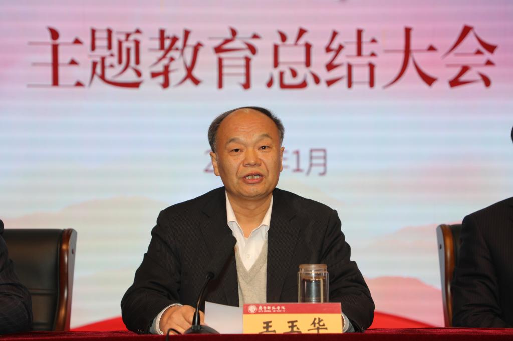 王玉华书记在讲话中对学习贯彻中央和省委“不忘初心、牢记使命”主题教育总结大会精神,特别是学习贯彻习近平总书记在总结大会上的重要讲话精神提出明确要求,指出全校上下要把思想和行动统一到习近平总书记重要讲话精神上来,把学习贯彻习近平总书记重要讲话精神作为当前重要政治任务抓紧抓好。王玉华书记强调,要结合主题教育中总结提炼的经验做法,围绕“不忘初心、牢记使命”制度的探索和建立,精心谋划下一步的工作,使制度优势真正转化为治理效能。一是坚决夯实不忘初心、牢记使命的思想基础,做到思想行动始终与初心相契合、与使命相符合、与时代相融合;二是持续用初心使命锤炼忠诚干净担当的政治品格,用初心使命涵养大义、激发动力、创造业绩、荡涤灰尘;三是不断在守正创新、笃实前行中践行初心使命,大力推进实践创新、制度创新,把不忘初心、牢记使命作为加强党的建设的永恒课题,作为全体党员干部的终身课题,以自我革命精神加强党的建设,将“不忘初心、牢记使命”进行到底!