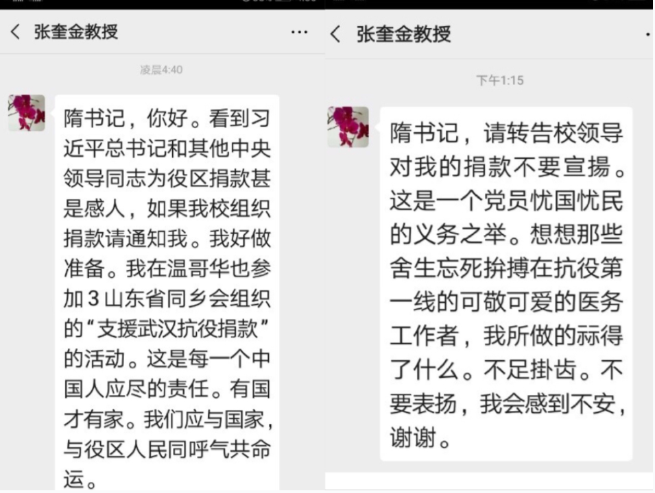 2月27日凌晨4:40,正在加拿大探亲的退休教授张奎金给离退休工作处党总支书记发来信息,表示自己想通过学校捐款来支持疫情防控的意愿。在了解到学校可以接收党员捐款的情况后,张奎金教授第一时间委托国内亲属将1万元捐款送到现场。他表示:“想想那些舍命拼搏在战“疫”第一线的可敬可爱的工作者,我所做的算得了什么。这是一个共产党员的义务之举……”